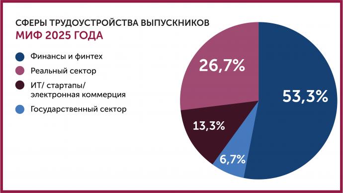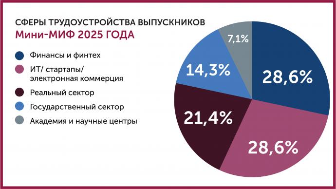 В 2025 году выпускниками программы стали 14 человек. 28,6% из них работают в сфере финансов и финтеха, еще около трети — в сфере информационных технологий, электронной коммерции или развивают собственные стартапы, остальные строят карьеру в реальном и государственном секторах.