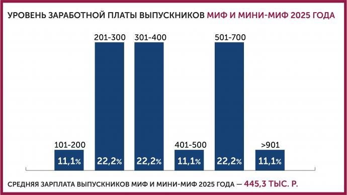 Проведенный Центром развития карьеры и лидерства РЭШ опрос показал, что средняя зарплата выпускников МИФ и Мини-МИФ 2025 года составляет 445,3 тыс. руб. в месяц. При этом 49,9% респондентов отметили значительный рост заработной платы после окончания обучения. Ежемесячный доход 22,2% выпускников составляет от 501 до 700 тысяч рублей, 11,1% — от 401 до 500 тысяч рублей, а еще 11,1% опрошенных зарабатывают более 900 тысяч рублей в месяц.