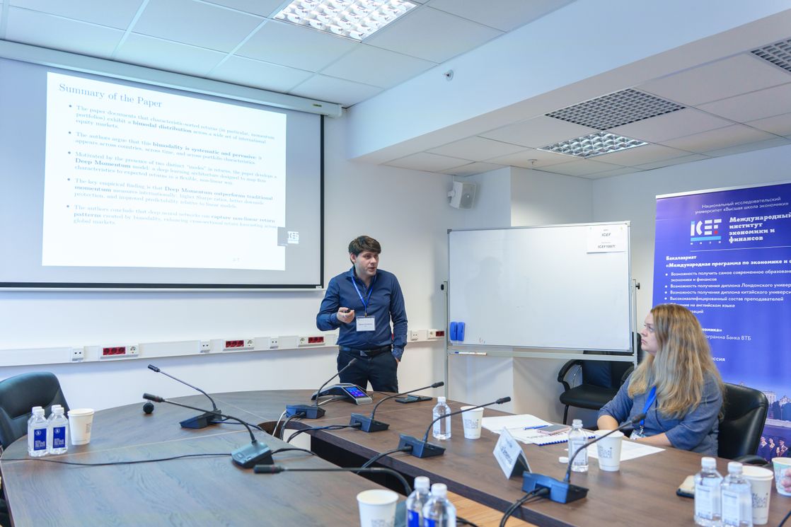 Алексей Колоколов в рамках первой сессии, посвященной новым эмпирическим исследованиям в сфере ценообразования активов, выступил дискуссантом к докладу Чулву Хана (Университет Сонгюнгван, Южная Корея) «Повсеместная бимодальность: международные данные о глубинном моментуме» (“Bimodality Everywhere: International Evidence of Deep Momentum”). Он представил подробные комментарии относительно выбранного автором подхода и ключевым выводам исследования.