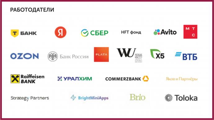 Среди работодателей выпускников 2025 года можно выделить такие компании, как Сбер, Т-Банк, Центральный банк РФ, Авито, Яндекс, Уралхим, Банк ВТБ, Ozon, МТС, Райффайзен Банк, X5, Toloka AI, Яков и Партнеры, БРИО КАПИТАЛ (Brio Capital) и др.