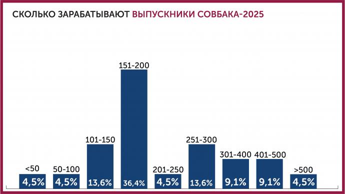 Согласно опросу, проведенному Центром развития карьеры и лидерства РЭШ среди выпускников Совместной программы НИУ ВШЭ и РЭШ 2025 года, средний уровень дохода молодых специалистов составил 230,7 тысяч рублей в месяц. При этом 36,4% опрошенных ежемесячно получают от 151 до 200 тысяч рублей, 13,6 % — от 301 до 400 тысяч, 9,1% — от 401 до 500 тысяч рублей*.